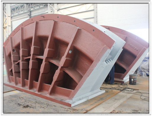 江西五桂大桥是上饶市的城市景观桥梁,为独塔悬索桥,主索鞍为双鞍头左右对称组合体,主索鞍组合体重约85吨,鞍体采用铸造结构,材质为ZG275-485铸钢,两对称鞍头用十根刚性拉杆螺栓连接。主跨自锚散索套全桥共2套,材质为ZG35Mn,每套重约8t。边跨地锚散索套全桥共1套,材质为ZG35Mn,每套重约18t。