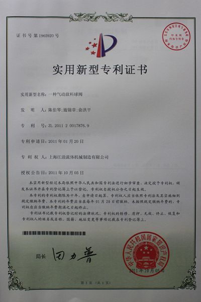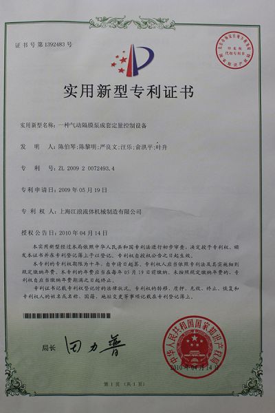 气动隔膜泵自动液位控制设备实用新型专利证书