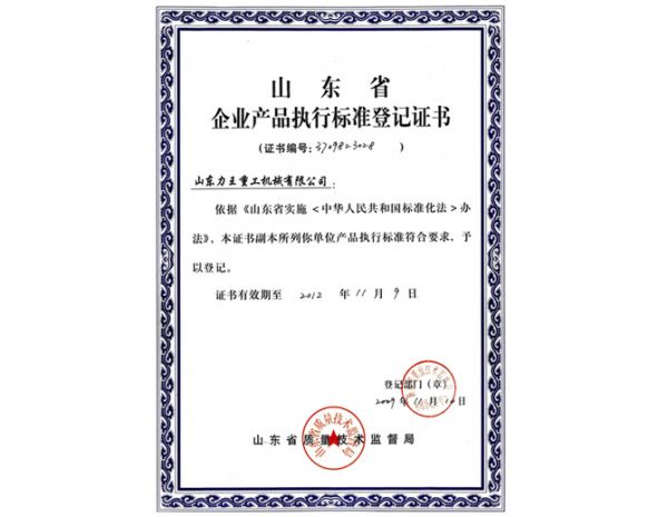 企业产品执行标准登记证书